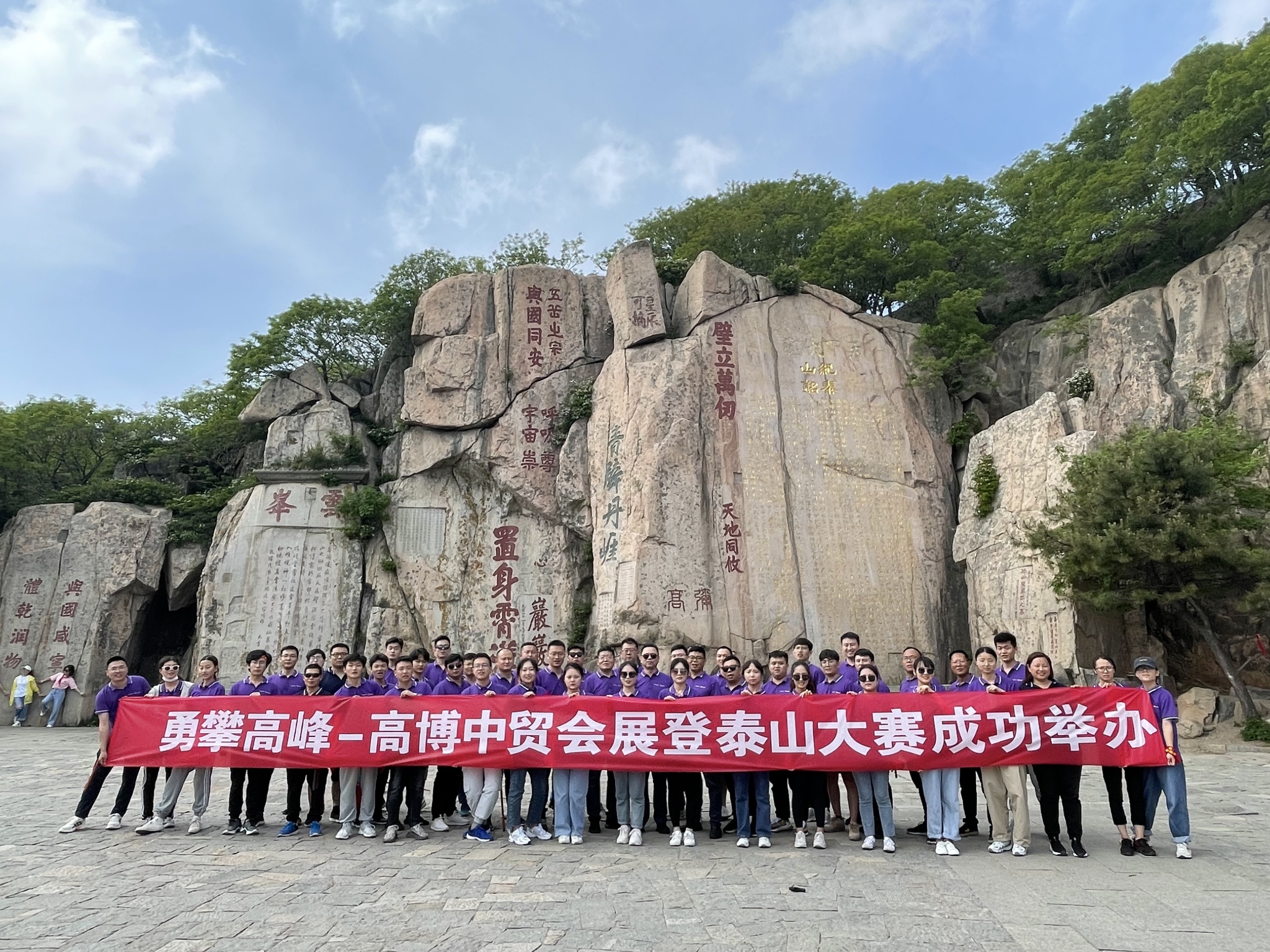 5月31日早,全體員工統(tǒng)一著工裝,乘坐大巴前往泰山,員工們熱情高漲,到達(dá)中天門后開始徒步登山,在中貿(mào)集團(tuán)(高博中貿(mào)國際會展集團(tuán))董事長杜磊的帶領(lǐng)下,向玉皇頂發(fā)起沖鋒。1532.7米的海拔,3000余級臺階,中貿(mào)家人們齊心協(xié)力,一路同心,終登泰山之巔。“會當(dāng)凌絕頂,一覽眾山小”,此次泰山之行也讓中貿(mào)人切實(shí)感受到,堅持是最大的力量,只有不斷接受新的挑戰(zhàn),勇于突破,才能看到更美的風(fēng)景。登高望遠(yuǎn),高博中貿(mào)國際會展也將再續(xù)新發(fā)展,再啟新征程!