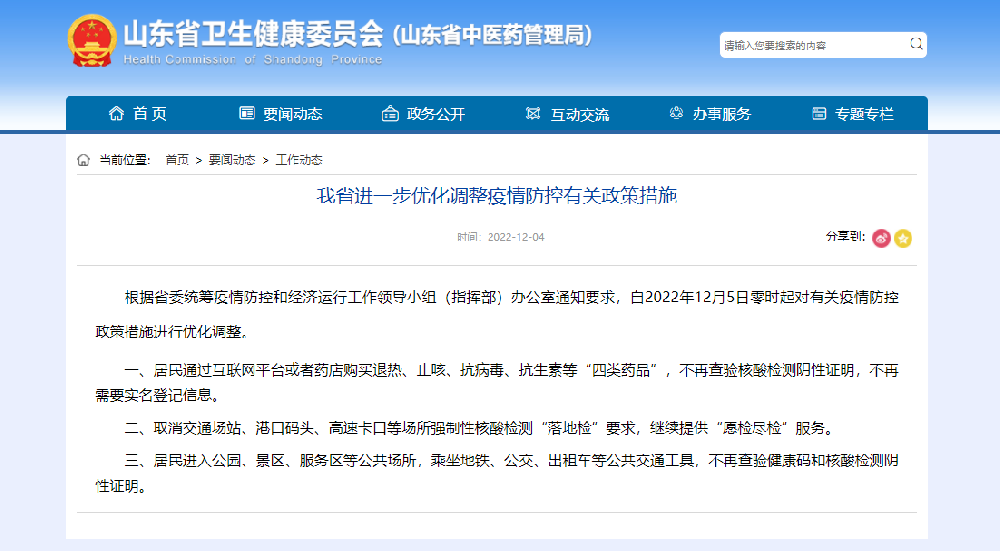 12月4日,山東省衛(wèi)健委發(fā)布消息:根據(jù)省委統(tǒng)籌疫情防控和經(jīng)濟(jì)運(yùn)行工作領(lǐng)導(dǎo)小組(指揮部)辦公室通知要求,自2022年12月5日零時(shí)起對(duì)有關(guān)疫情防控政策措施進(jìn)行優(yōu)化···